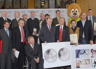 Die neue Sportmarken-Serie "Für den Sport 2009" und die WM-Münze wurden heute in Berlin von Bundesfinanzminister Peer Steinbrück der Öffentlichkeit vorgestellt. Erste Exemplare gingen an Bundesinnenminister Dr. Wolfgang Schäuble, den Vorsitzenden des Vorstands der Stiftung Deutsche Sporthilfe, Werner E. Klatten, Berlins Innen- und Sportsenator Dr. Ehrhart Körting und Dr. Clemens Prokop, den geschäftsführenden Präsidenten des WM-Organisationskomitees.