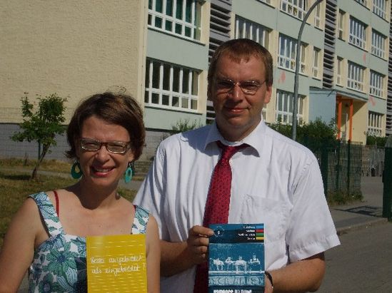 Tina Fischer (MdL) und Andreas Schluricke vor der Oberschule Schönefeld