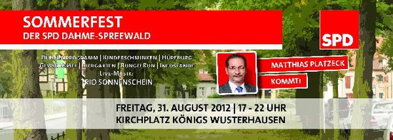 Der SPD-Unterbezirk Dahme-Spreewald und der SPD-Ortsverein Königs Wusterhausen laden herzlich ein zum Sommerfest am 31. August 2012 von 17 – 22 Uhr auf dem Kirchplatz in Königs Wusterhausen. Die Besucher erwartet ein abwechslungsreiches Programm.