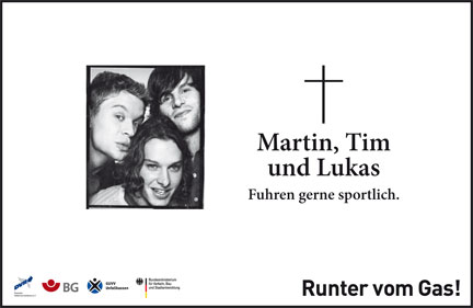 Die Verkehrssicherheitskampagne "Runter vom Gas!" wurde im März 2008 gemeinsam vom Bundesministerium für Verkehr, Bau und Stadtentwicklung und dem Deutschen Verkehrssicherheitsrat e.V. initiiert und macht in Kooperation mit der DGUV mit Autobahnplakaten in Todesanzeigen-Optik auf die Folgen unangepasster Geschwindigkeit aufmerksam.