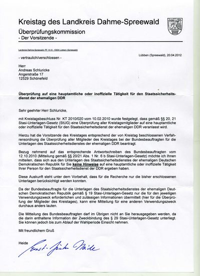 Der Kreistag Dahme-Spreewald hat am 10. Februar 2010 die Überprüfung aller Kreistagsmitglieder auf eine hauptamtliche oder inoffizielle Tätigkeit für den Staatssicherheitsdienst der DDR beschlossen.